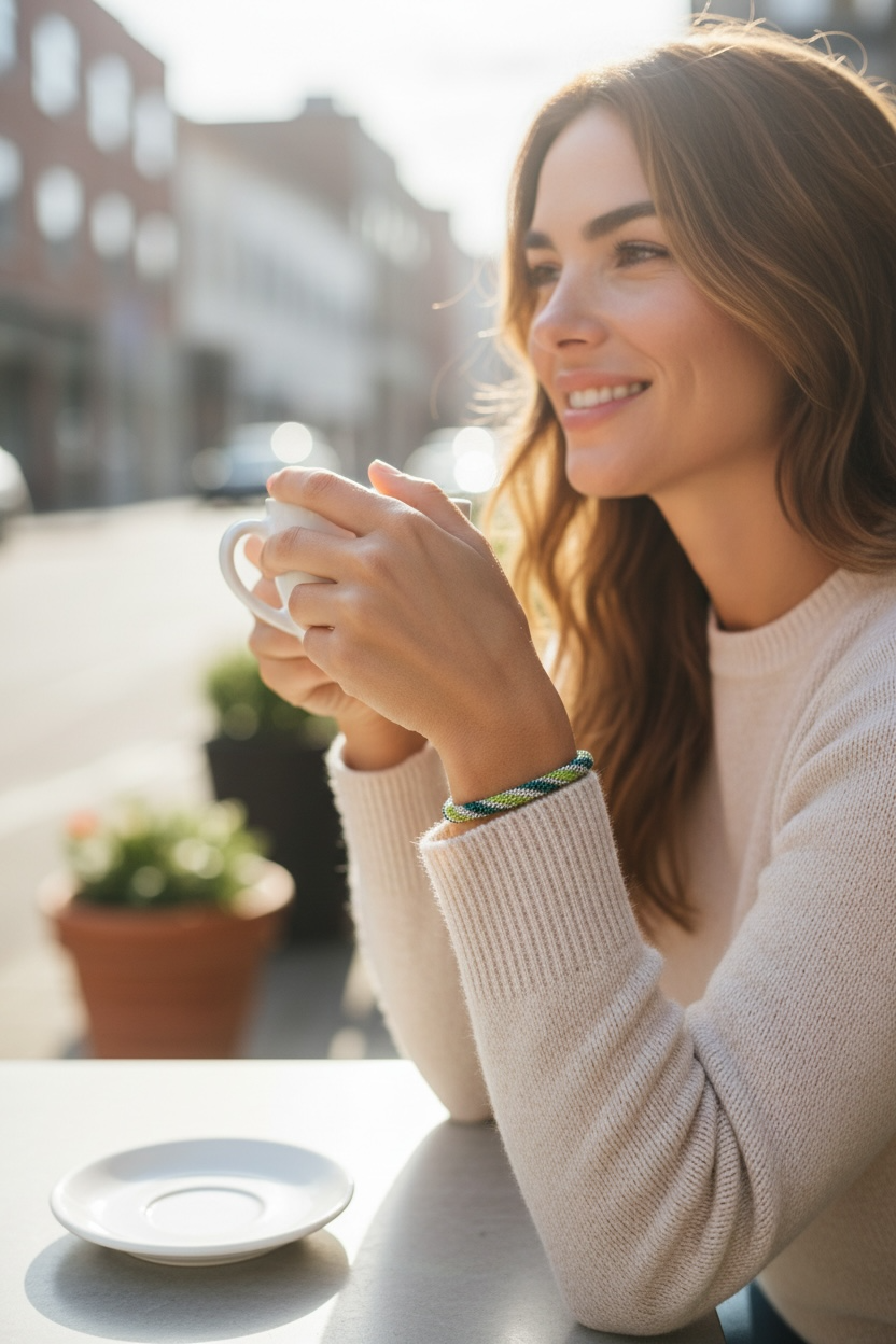 Avec son diamètre intérieur ajustable entre 5,5 et 6,2 cm, ce bracelet népalais s’adapte facilement à votre poignet pour un port confortable au quotidien. Il peut être porté seul pour une touche élégante ou associé à vos joncs bouddhistes afin de créer un effet accumulation chic et tendance.